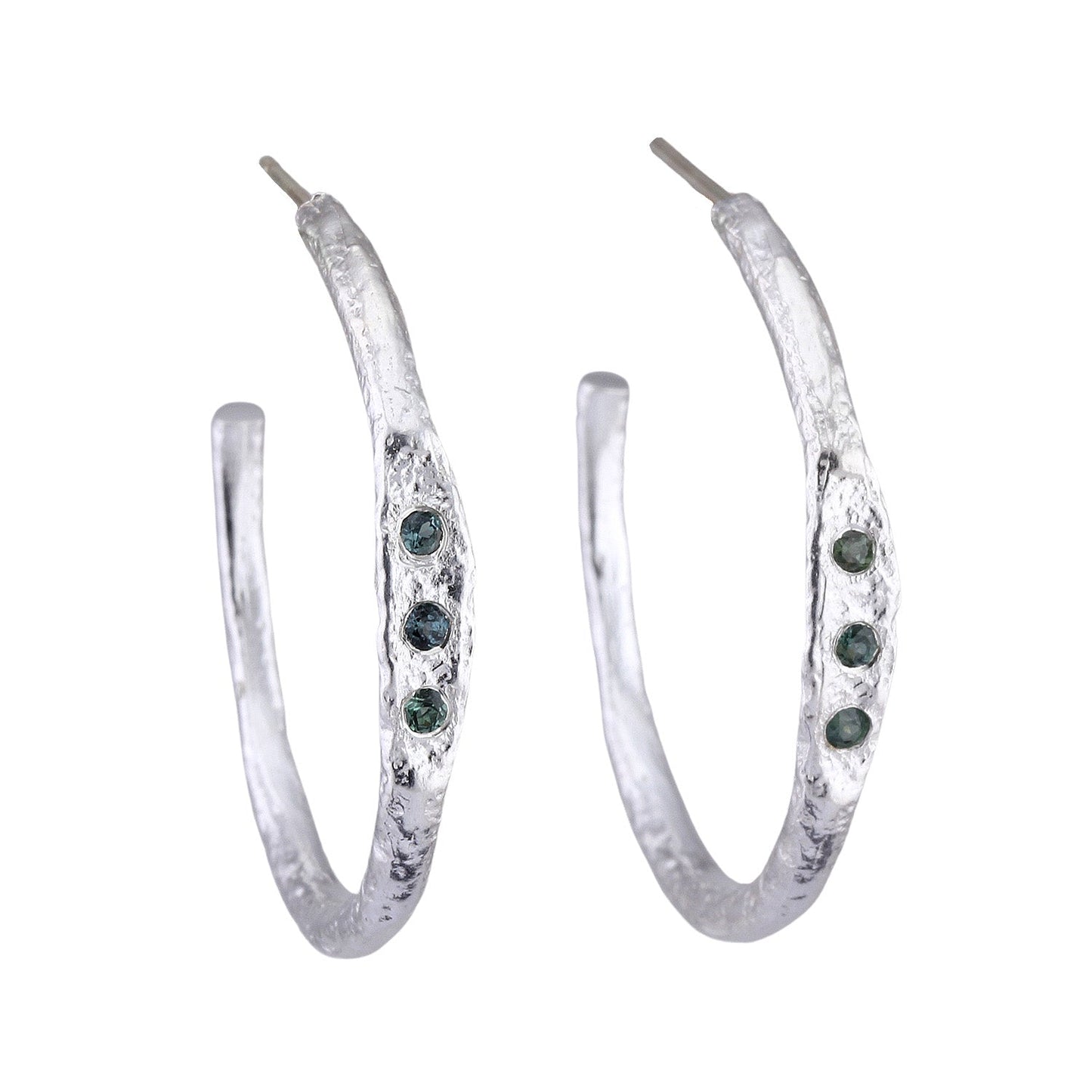 30mm pinched molten hoop earrings with choice of metal and gemstones, 14k yellow gold ear post and gf ear back.